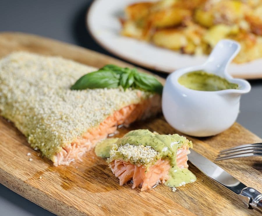 - מערבבים יחד את הפסטו והשמנת המתוקה ומורחים שכבה נדיבה מהשמנת על הסלמון.